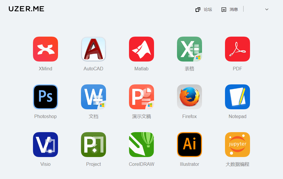 UZER.ME 目前支持 12 款应用:XMind、AutoCAD、Matlab、Excel、PDF、Photoshop、Word、PowerPoint、Firefox(没错这是个浏览器)、Notepad、Visio、Project、CDR、Illustrator、Jupyter。